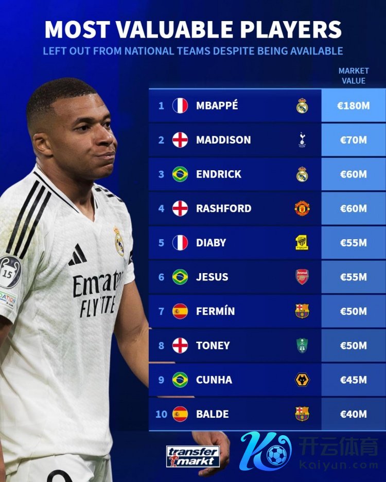 11月17日讯 德国转会市集统计了落第本期国度队(不包含伤缺)的球员身价,并排出榜单,姆巴佩1.8亿欧居首。